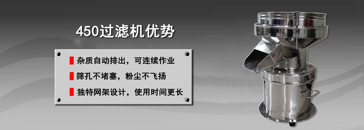 450過濾機(jī)是為適用于漿液過濾作業(yè)、粉粒分級(jí)而專門設(shè)計(jì)一種高效率、低噪音小型單層篩分機(jī),它集液體過濾、粉粒分級(jí)功能為一體。在面粉、油漆過濾行業(yè)表現(xiàn)尤為卓越,如325目過濾比重1.1的噴漆料,每小時(shí)可達(dá)1200公升,30目篩分面粉每小時(shí)可處理700公斤。