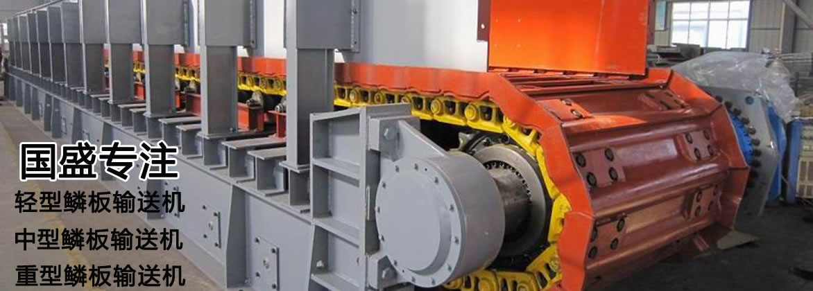 鱗板式輸送機采用節(jié)距高強度模鍛鏈條為牽引件,兩根鏈條繞過安裝在機體頭部的一對驅(qū)動鏈輪和機體尾部的一對張緊輪聯(lián)成封閉形回路,在兩排鏈條的每個鏈節(jié)上裝配了相互交迭的、重型結(jié)構的輸送槽而成為一個連續(xù)的能夠運載物料的輸送線路。其自重和物料的重量由安裝在機體上的多排支重輪、鏈托輪和滑道梁支承。傳動系統(tǒng)經(jīng)交流變頻調(diào)速電動機聯(lián)接減速機,再由漲套與驅(qū)動裝置直聯(lián)驅(qū)動運載機構低速運行。將尾部料倉卸入的物料沿輸送線路運至機體的前方排出,通過鏈條的傳動將鱗板上的物料輸送到卸料處,實現(xiàn)向下方的工作機械連續(xù)均勻輸送的目的。